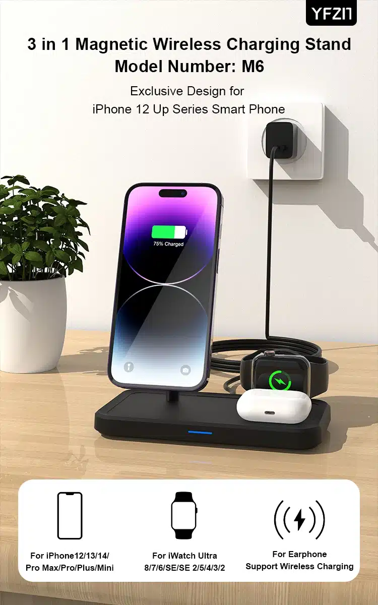 Charge all your devices with ease using the YFZN 3 in 1 Wireless Charging Station.