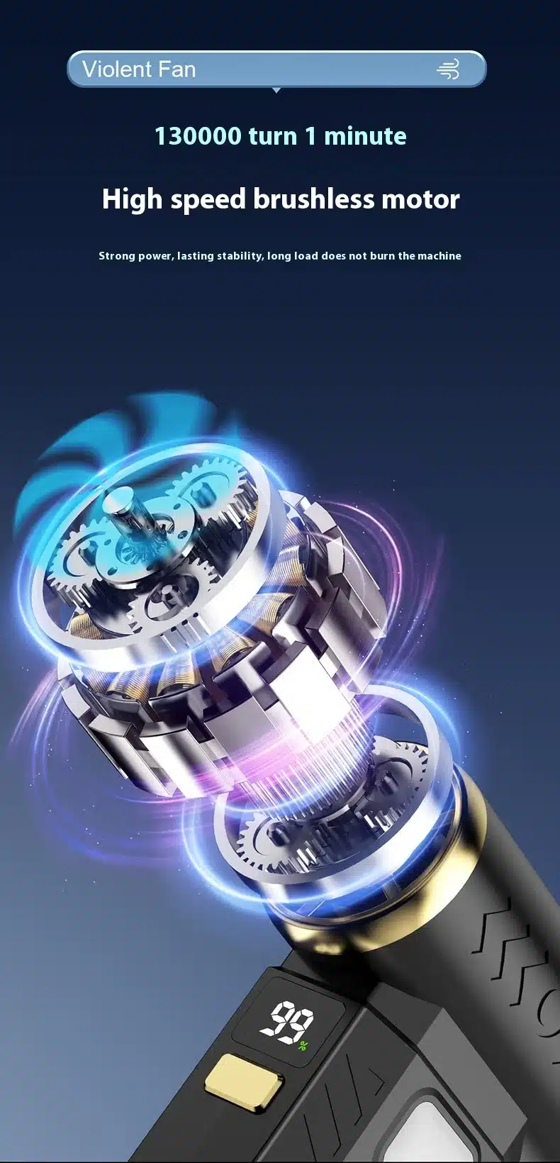The fan features a high-speed brushless motor for efficient and whisper-quiet performance.