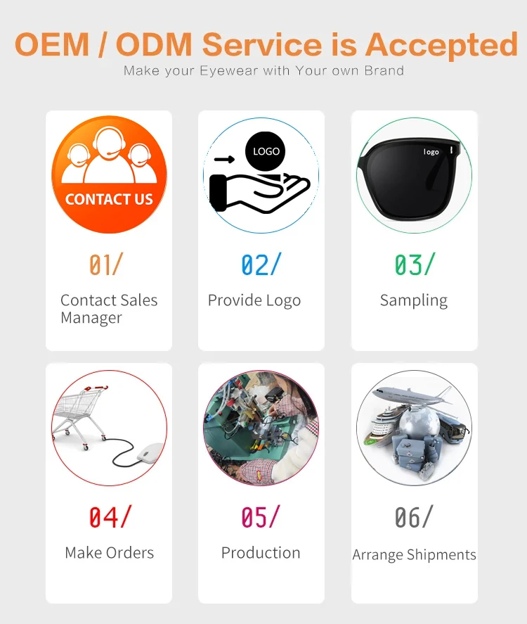 Q1: Can I put my brand logo?A: Yes, OEM is welcomed, we can make your logo by printing, stamping or sticking.Q2: How about the quality?A: We build a strict quality control system such as to ensure pass quality standard and meet our clients’ requirements.Q3: Can I have samples for approval before order?A: Yes, samples will be sent to you for checking the quality first. After the confirmation of bulk order, we could make pre-production samples for final approval in accordance with your requirement.Q4: Can I start with small order?A: It is negotiable. Normally, we have MOQ limit on different materials eyeglasses. However, smaller order is also welcome so that you could test your market. We sincerely wish that both of our businesses would grow together.Q5: Can you refund the sample cost when I place an order?A: Yes, sample fee is refundable once you place a bulk order.
