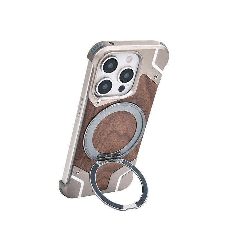 Upgrade your iPhone 15 Pro Max with this premium Aluminum Alloy Bumper Metal Frame Phone Case combined with real walnut wood for a perfect blend of style and protection. Designed with an invisible magnetic stand, this case offers both elegance and functionality.